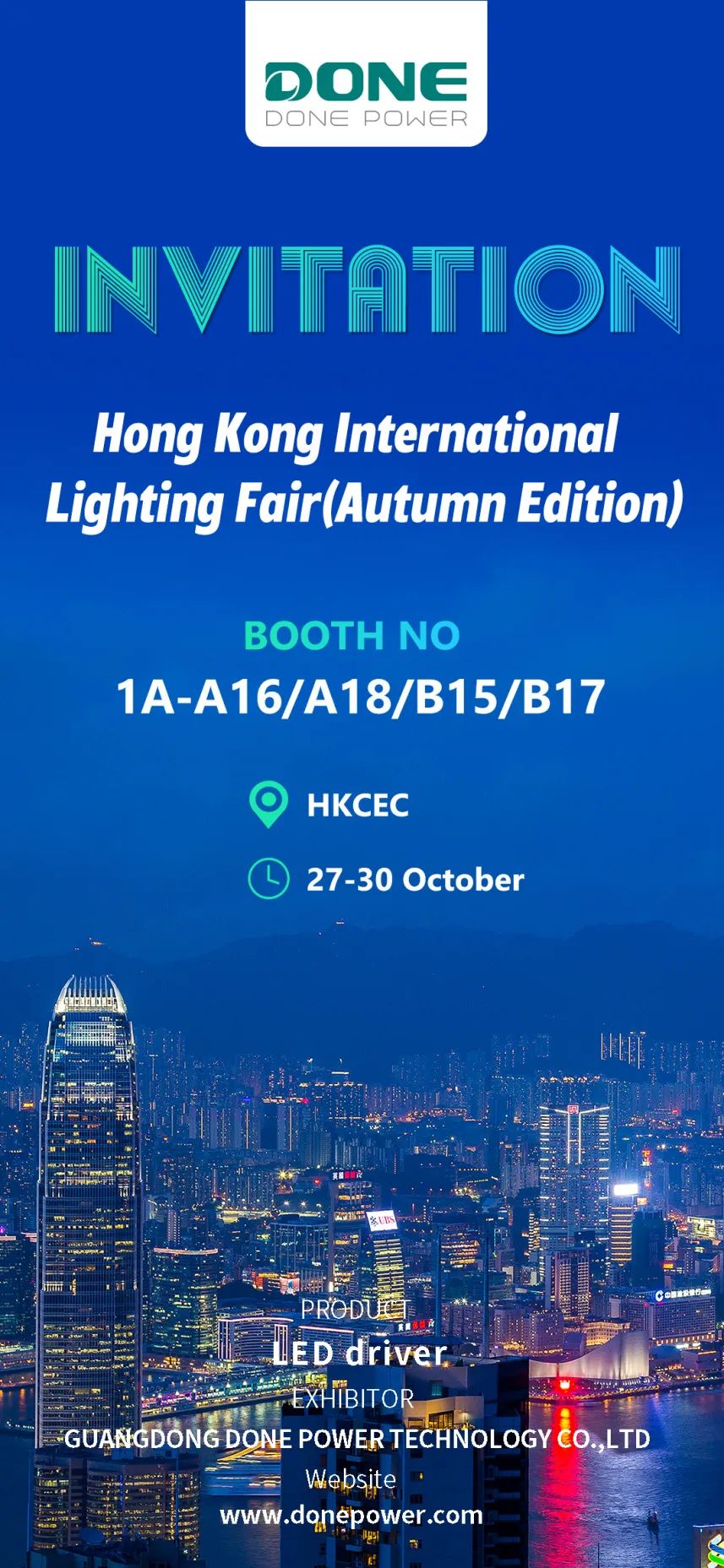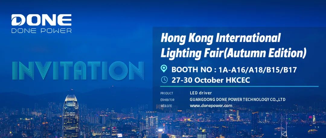 the 25th hong kong international lighting fair (autumn edition), organized by the hong kong trade development council, will be held from 27 to 30 october 2023 at the hong kong convention and exhibition centre. on this important platform for global business exchange, done, a global brand high-power lighting led driver one stop service provider, will also be present at the autumn lighting fair, booth no. 1a-a16/a18/b15/b17, to showcase our innovative products and technologies.