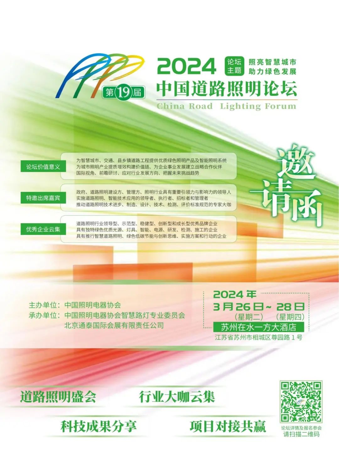 中国道路照明论坛以“照亮智慧城市 , 助力绿色发展”为主题,定于2024年3月26日-28日在苏州在水一方大酒店召开。此次论坛由中国照明电器协会主办,中照协智慧路灯专业委员会及通泰传媒承办,是国内道路领域最具影响力的交流平台。