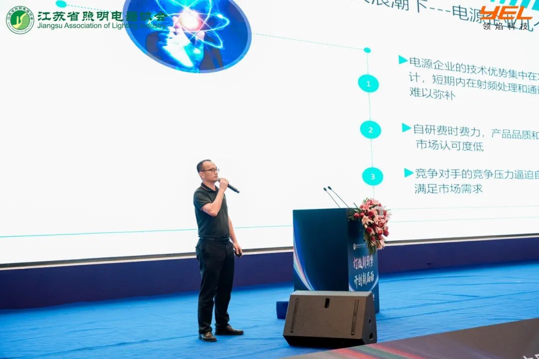 中国轻工业联合会副会长、中国照明电器协会理事长何烨,江苏省照明电器协会理事长虞炎秋,江苏省工业和信息化厅二级巡视员是清,中国照明学会驻会副理事长高飞,江苏省商务厅国际经济贸易研究所所长邢冲等一众业界专家领导出席此次盛会。本次会议以“打造新引擎 开创新局面”为主题,一众专家学者、业界同仁纷纷就此发表演说。东菱电源研发总监张鸿生也应邀出席,并在会议上分享了《智慧路灯一体化电源pa凯发官网的解决方案》专题报告。