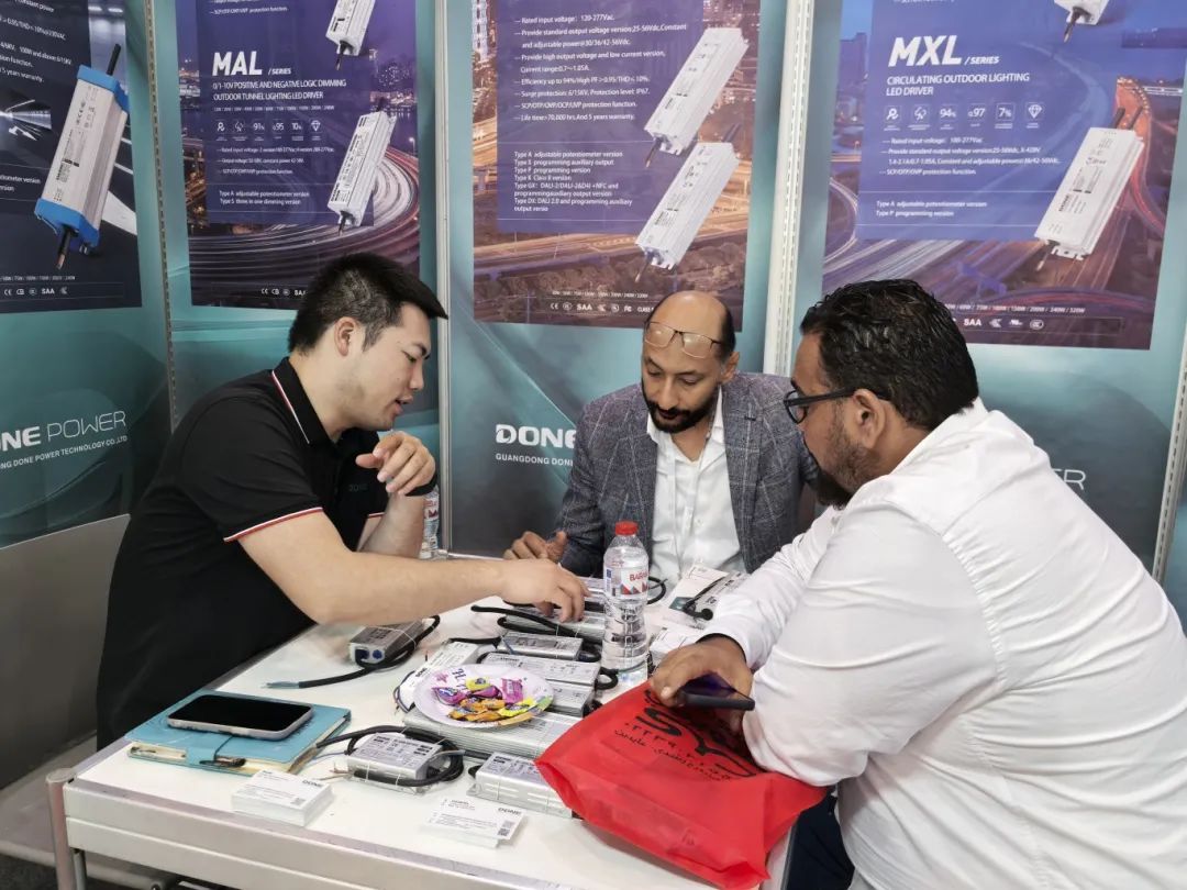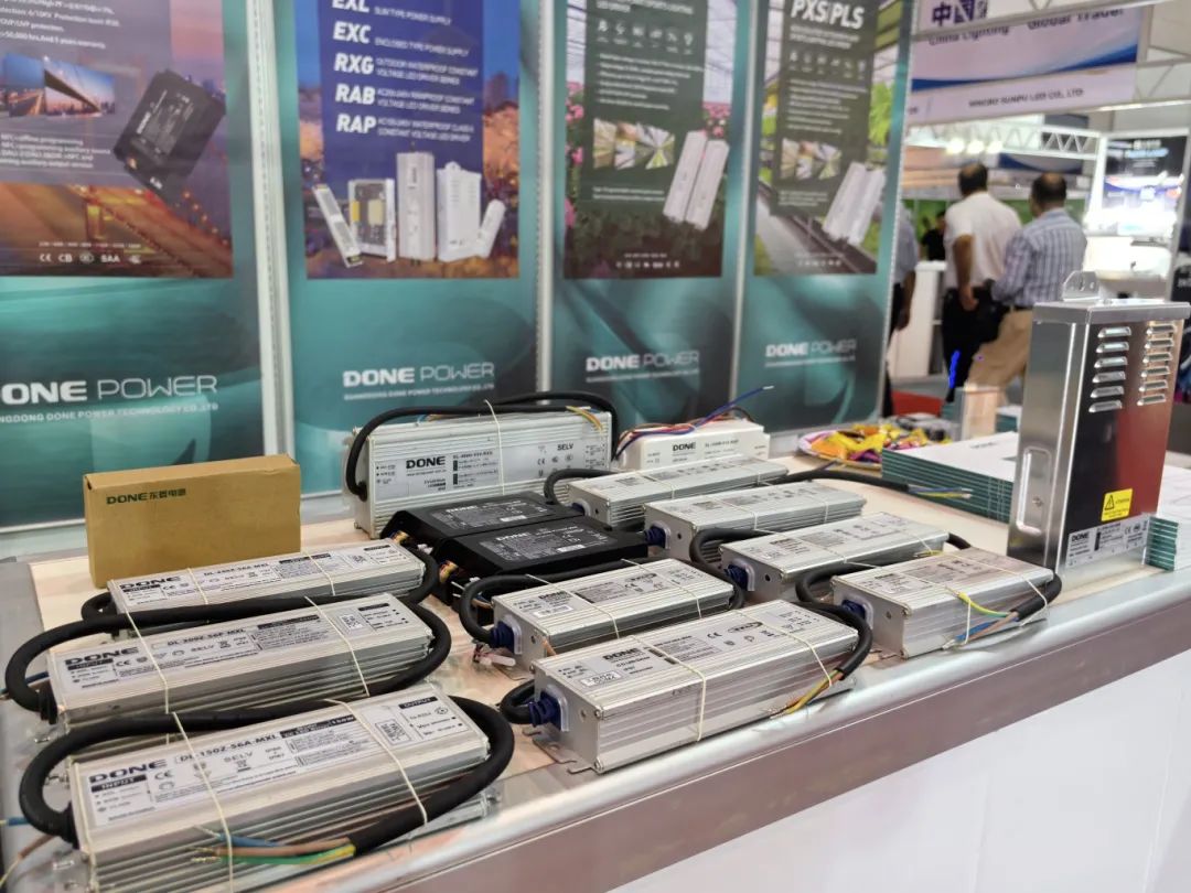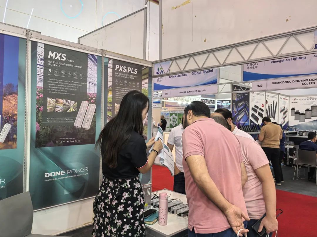 the led lighting industry is not only an important part of china’s strategic emerging industries but also an inevitable trend in global green development. at this exhibition, done power showcased star products such as the nfc programmable european road lighting power supply mxk series, the non-isolated plant/sports lighting power supply pxs/pls series, and the bar-type honeycomb switching power supply exc series. these products have significant advantages in energy-saving, environmental protection, and intelligence, meeting the egyptian market's demand for high-quality led lighting products.