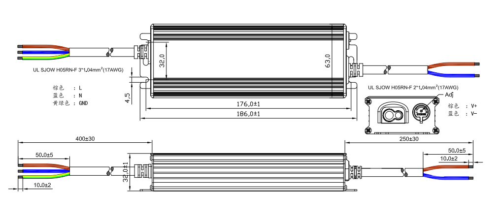 输入线材:ø8.2橡胶线3x1.0mm² x400mm