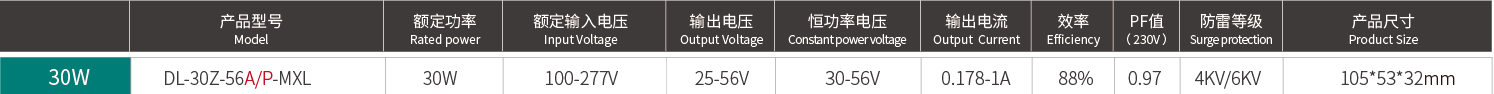 产品电性:20-56v标准输出电压,36/42-56v 0.7-1.05a输出电压范围内功率恒定可调